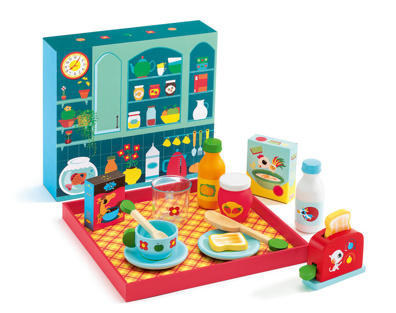 Loading... Please wait...Djeco Breakfast Time set is a delightful play food set which uses the wooden box it comes in to turn into a table with background.