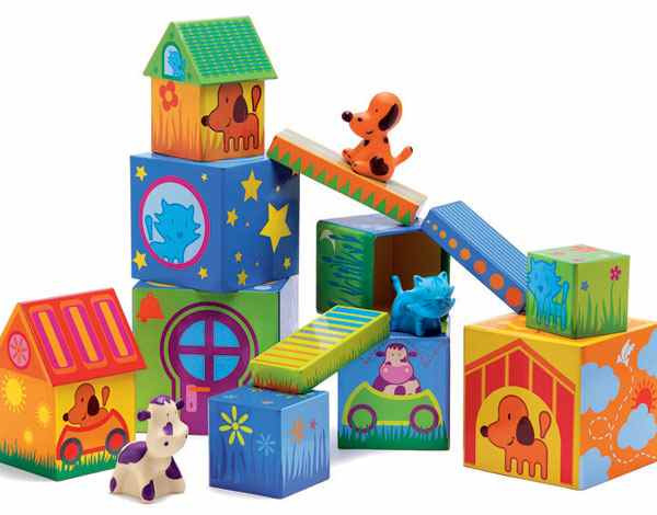 Includes: 14 brightly colored blocks with 3 fun animals (dog, cat & cow).