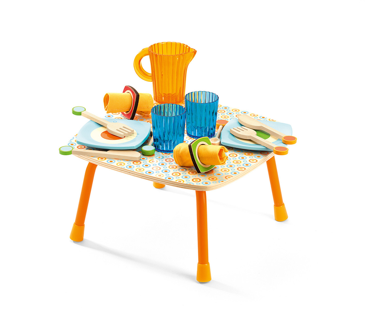 Includes: wooden accessories, 2 plates, plastic jug, 2 tumblers, napkins & napkin rings and a table to serve on.