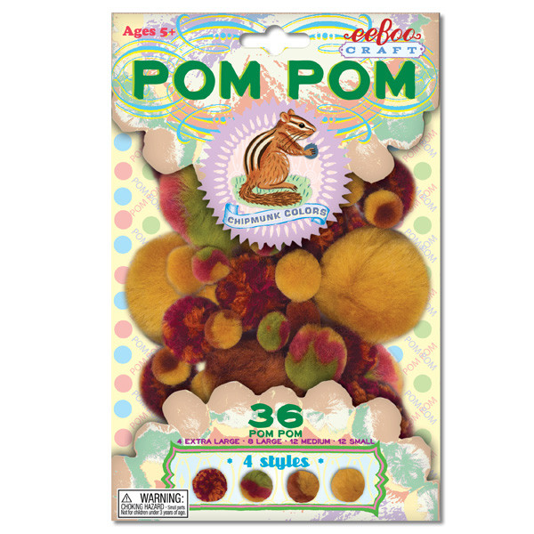 Pack includes: 4 Pom Pom Styles - 36 Pom Poms; 4 Extra Large,8 Large, 12 Medium, 12 Small & Pom Pom Project Ideas on the back.