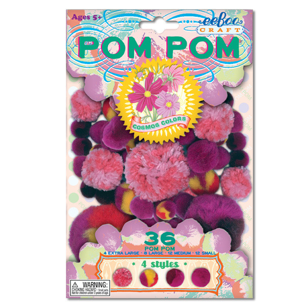 Pack includes: 4 Pom Pom Styles - 36 Pom Poms; 4 Extra Large,8 Large, 12 Medium, 12 Small & Pom Pom Project Ideas on the back.