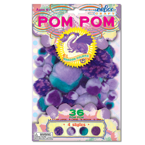 Pack includes: 4 Pom Pom Styles - 36 Pom Poms; 4 Extra Large,8 Large, 12 Medium, 12 Small & Pom Pom Project Ideas on the back.