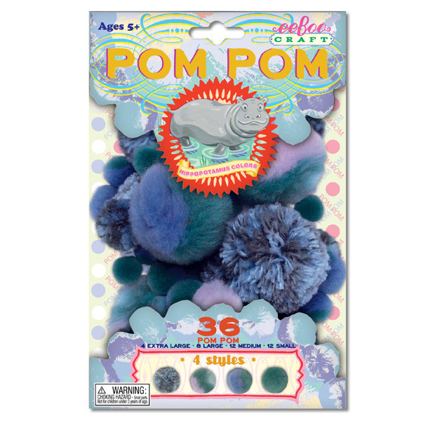 Pack includes: 4 Pom Pom Styles - 36 Pom Poms; 4 Extra Large,8 Large, 12 Medium, 12 Small & Pom Pom Project Ideas on the back.