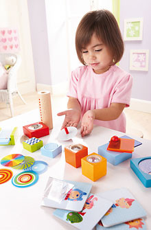 Set contents: mirror block, faceted block, color spinning top, large color blender, jiggling block, kaleidoscope, 2 effect blocks, Moiré block, prism with 4 pictures cards & cinema block with four animal tiles