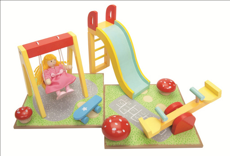 Includes a swing, a slide and a see-saw complete with baseboards.