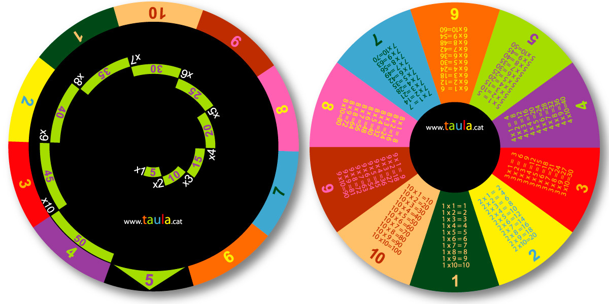 Example: to consult multiplication table 6 turn the disk until you see number 6 (colour orange) in window 'A', you will see all the results in the orange spiral.